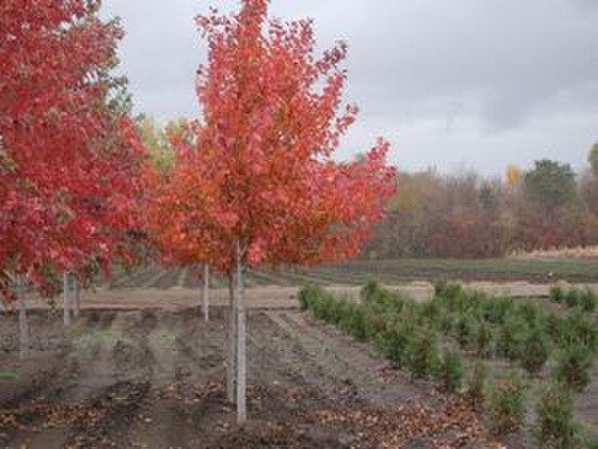 A cross between 'October Glory'and 'Red Sunset' that has a uniform growth habit with an open, rounded form. Consistent and stunning orange-red color in the fall that is about two weeks earlier than most rubrum. Showy, red flowers along the branches in earl